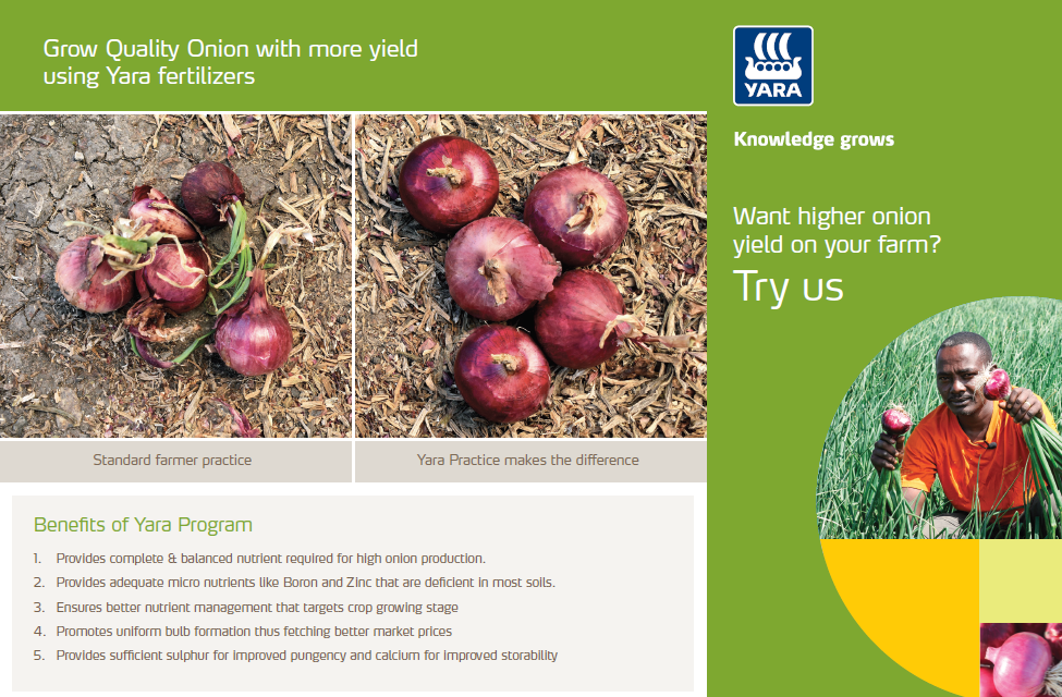 Yara's fertiliser program for onion is based around YaraLiva calcium nitrate fertilisers and YaraMila compound NPKS or Chafer starter solution fertiliser together with YaraVita micronutrients.