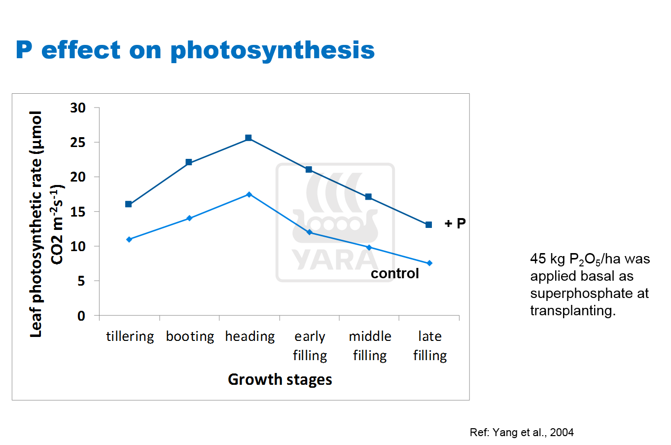 After heading, P uptake decreases and P is translocated from leaves to grain. However, a good long lasting P supply is vital for dry matter production, since the lack of P limits the photosynthetic rate.