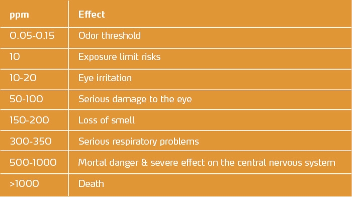 H₂S has adverse effects on health. It is very irritating to the eyes and the mucous membrane lining the respiratory tract. Above a certain concentration, hydrogen sulphide anaesthetises the olfactory nerve which means that the smell “disappears “ and the H₂S can’t be detected at all. Thus, H₂S can hit where we least expect it. For a healthy adult, the effects are lethal above 300 ppm (parts per million). Under certain conditions, in a confined space, hydrogen sulphide can kill instantly.