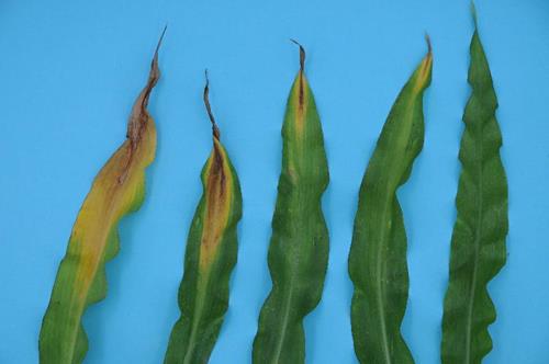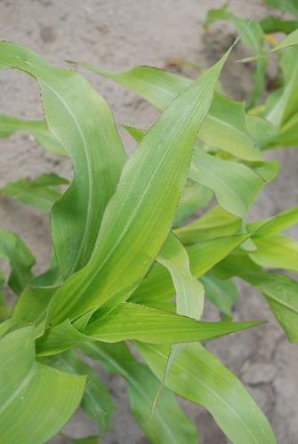 On the older leaves, V-shaped yellowing on the leaf tips progresses towards the base, so that leaves finally turn uniformly pale green/yellow.