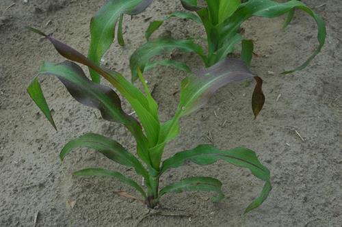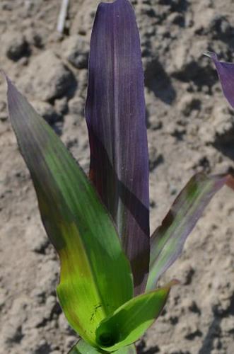 Some maize hybrids show reddish leaves in younger development stages although P supply is sufficient.