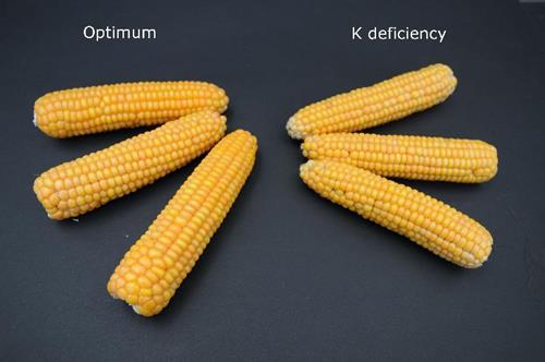 The cobs of K-deficiency plants are small and peaked. Grains in the cob tips are only poorly filled.