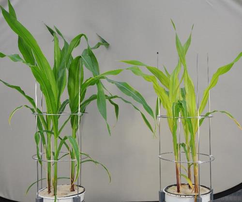 Plant shows stunted, erect growth with interveinal chlorosis of the younger leaves.