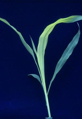 Plant shows stunted, erect growth. Seen from a distance, younger leaves are colored uniformly pale, but when you look at them closely, it's rather an interveinal chlorosis. The yellowgreen leaves show a narrow brown seam along the leaf margin.