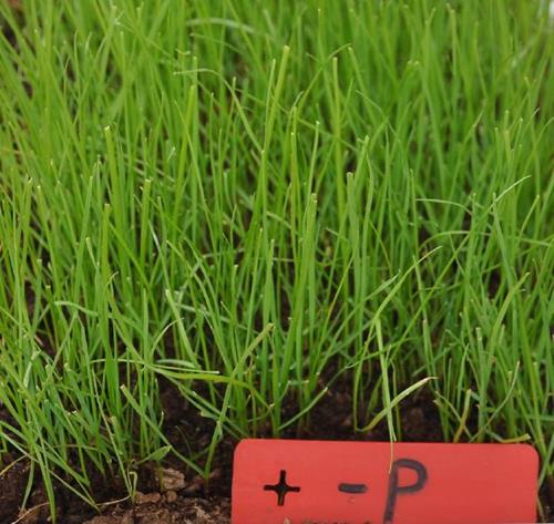 Reduced growth and tillering, sometimes with purple discoloration. Tips of older halms show a yellow to reddish-brown color and may die off. General leaf color remains dark green. Phosphorus uptake is highest in early growth stages. Deficiency symptoms are therefore rather to be found in older plants when P levels decreased.
