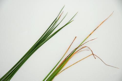 Older leaves show tip chloroses and necrosis, proceeding towards the leaf base.