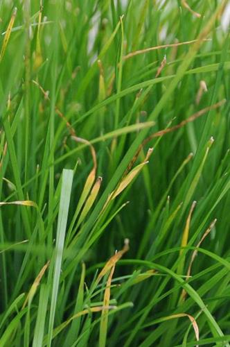 Older leaves show tip chloroses and dieback. Diffuse brown blotches disperse on the leaf blade and coalesce to further necrosis.