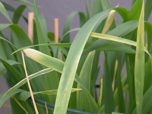 Plants show dry, white and twisted or curled leaf tips (white tip). Young leaves wilt on their tips, whereas the basal leaves remain dark green.
