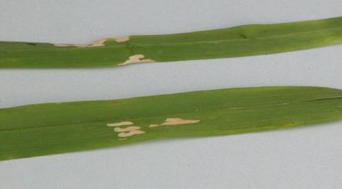 Leaves have grey specks or light brown lesions and they break/bend over near the centre section. Some leaves show signs of chlorosis which eventually hides the lesions.