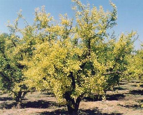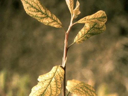 The severity of the chlorosis increases towards the youngest leaves at the tip of the shoot.