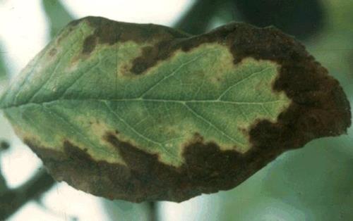 With ongoing deficiency, the leaf margins show dark brown, strictly delimited scorch.