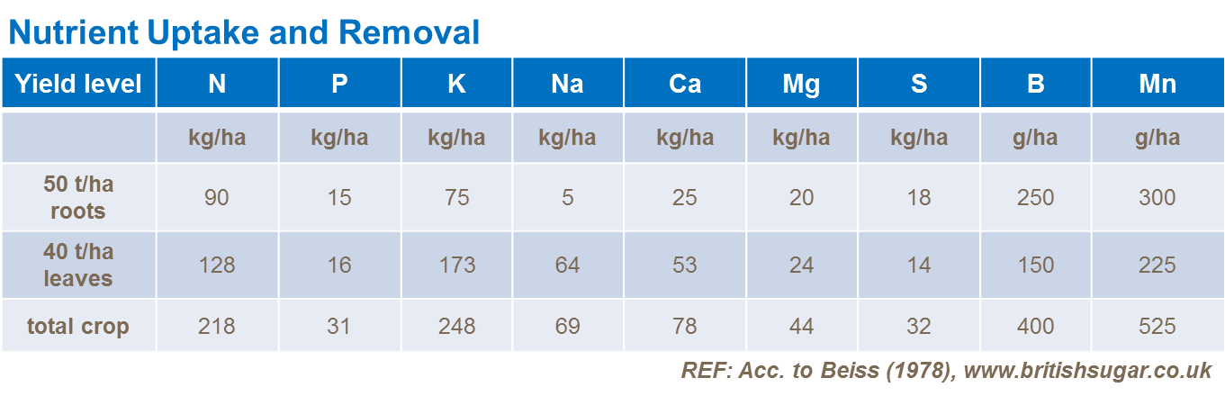 Sugar beets are known to require large amounts of micronutrients. Especially boron, manganese, copper and zinc. The table gives average figures of removal of micronutrients in a sugar beet crop.